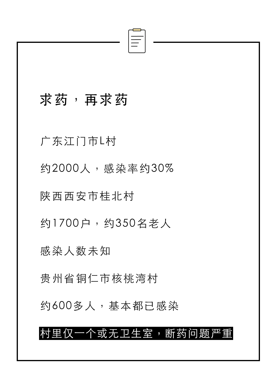核桃湾村一直没什么人戴口罩,12月初生活基本无异,徐强看到一线城市抢药的新闻,也没想着囤药。直到一周前,奶奶突然说有些腰疼,第二天就起不了床了,他才感觉有些不对,赶去村卫生室时,已经挤满了人,村医只能开一些中药或者输液。村长跟他说,80%的人都感染了。没有抗原,两三个有症状的老人家属都以为是普通感冒,用枇杷花煮水喝。
