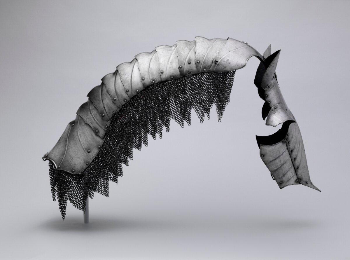展览中有两件哥特式晚期的马面甲,借自大都会艺术博物馆,由米兰盔甲师罗曼‧德‧乌尔辛(Romain des Ursins)制作。这位住在里昂的盔甲师打造出充满德国风格的马颈甲和面甲。马颈甲由许多片钢铁板甲(lames)铆接组成,可以保护马的脖子,也能活动自如。他刻制的马面甲简洁俐落,配合马脸的弧度设计。十九世纪后又局部新增一些铠甲,包括保护耳朵和眼睛部位的马面甲,以及在马颈甲边缘保护鬃毛的锁子甲(mail)。